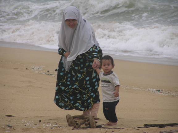 Bersama salah seorang anaknya menyusuri pantai berombak ganas.