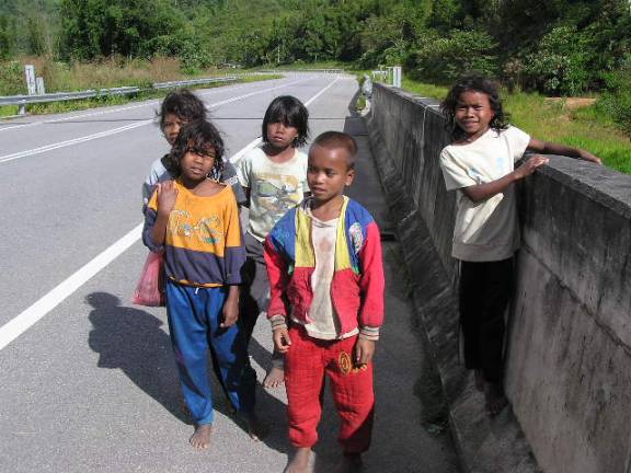 berjumpa sekumpulan kanak-kanak orang asli berjalan di tepi jalanraya tanpa